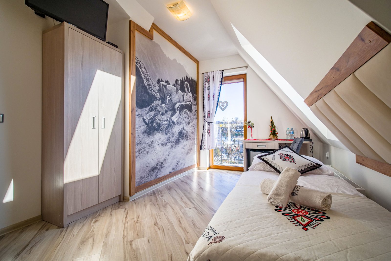 Pokój 3 osobowy. Pokój posiada łazienkę - suszarka, ręczniki, zestaw kosmetyków. W pokoju lodówka, bezpłatne WIFI, telewizor. Pokój dysponuje zestawem do kawy i herbaty. Woda mineralna, herbata, kawa. Balkon z widokiem na góry.