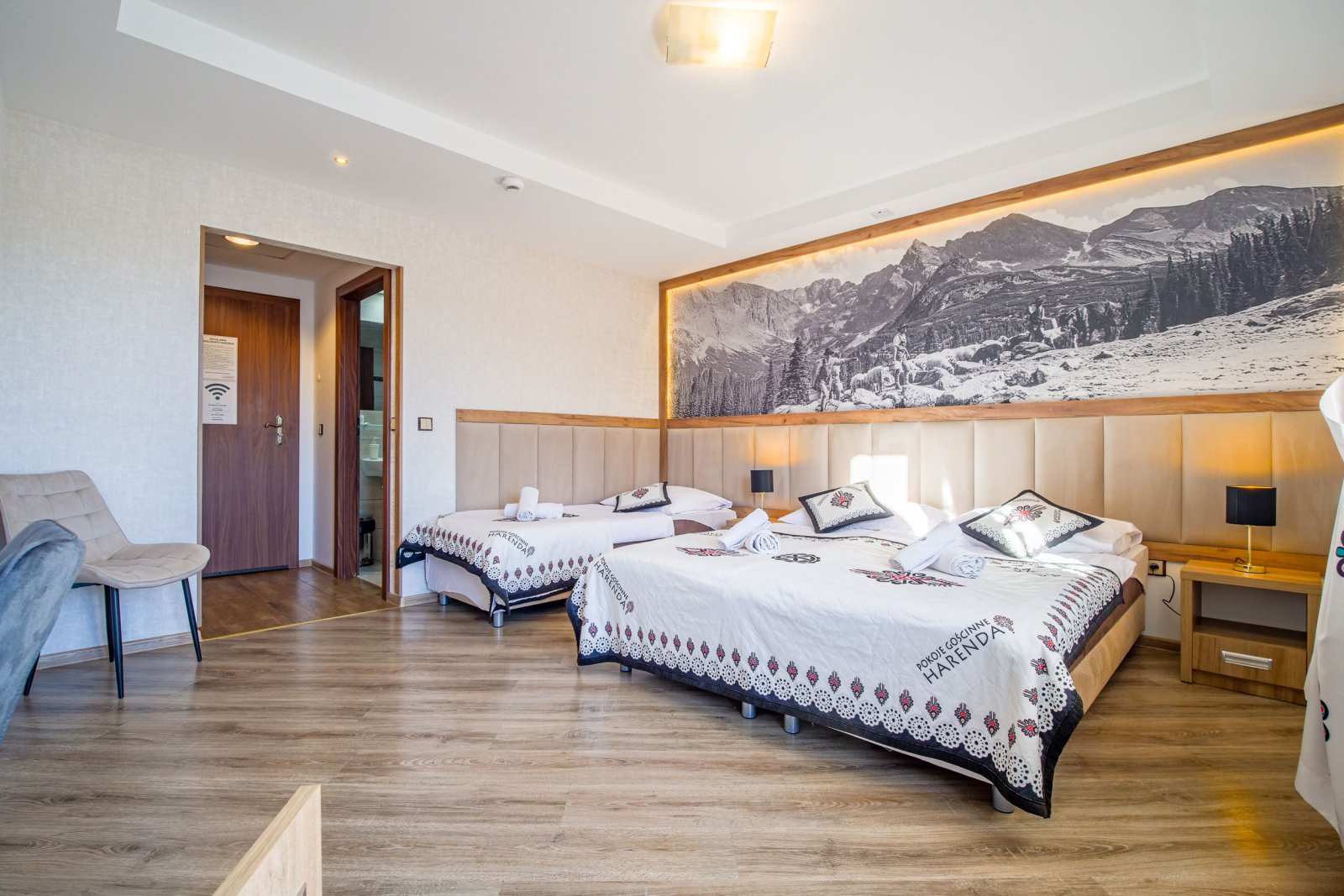 Pokój 3 osobowy. Pokój posiada łazienkę - suszarka, ręczniki, zestaw kosmetyków. W pokoju lodówka, bezpłatne WIFI, telewizor. Pokój dysponuje zestawem do kawy i herbaty. Woda mineralna, herbata, kawa. Balkon z widokiem rzekę - kojący szum potoku.