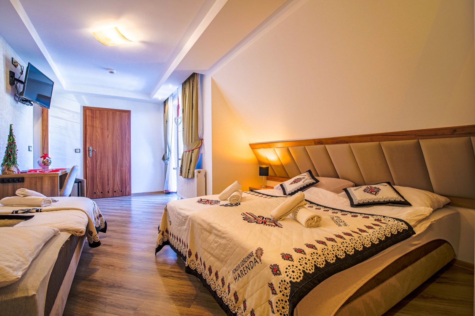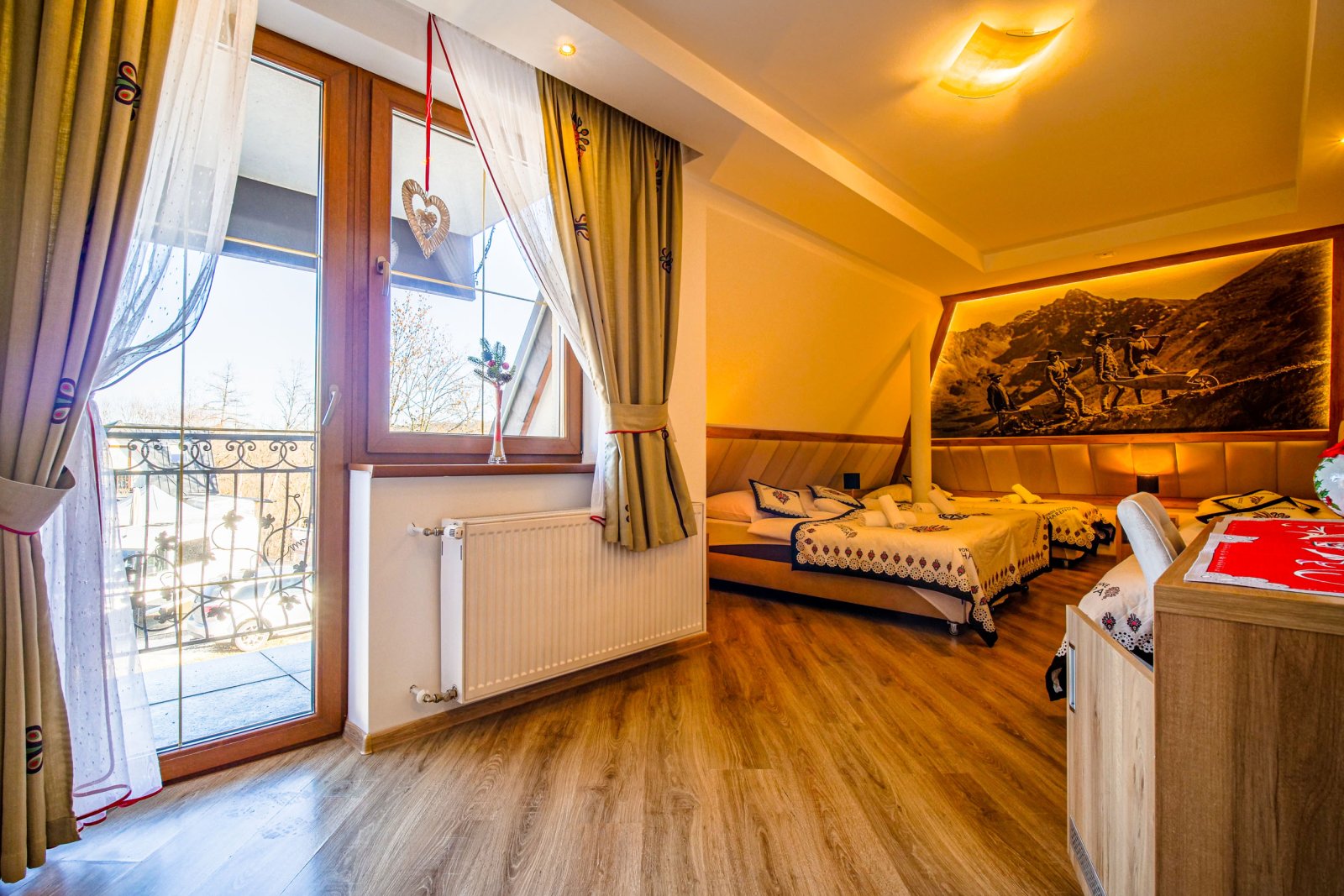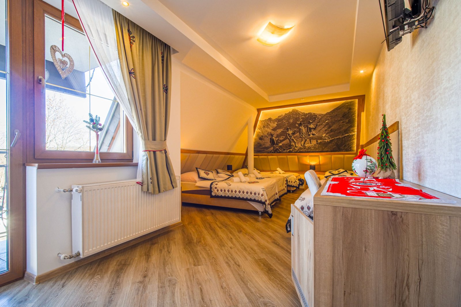 Pokój 5 osobowy. Pokój posiada łazienkę - suszarka, ręczniki, zestaw kosmetyków. W pokoju lodówka, bezpłatne WIFI, telewizor. Pokój dysponuje zestawem do kawy i herbaty. Woda mineralna, herbata, kawa. Pokój posiada balkon.