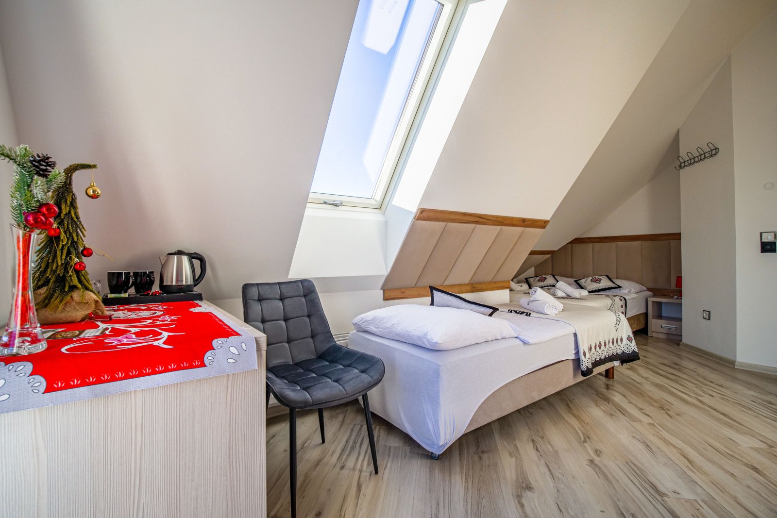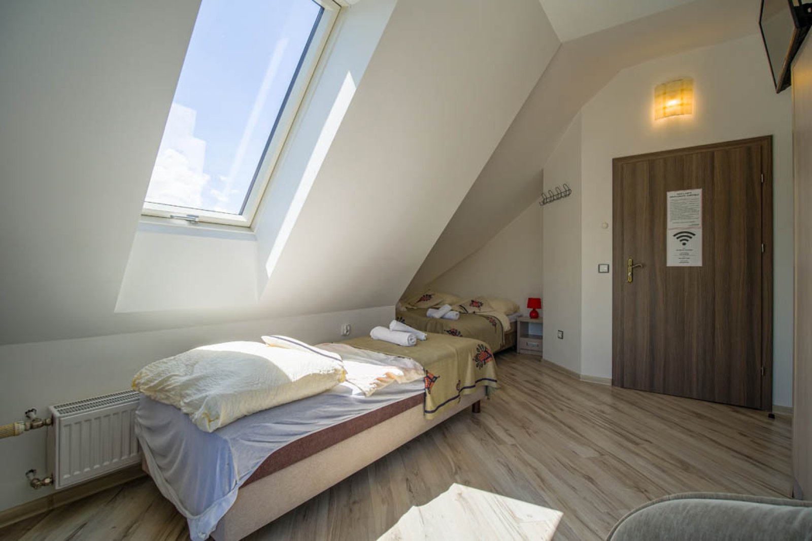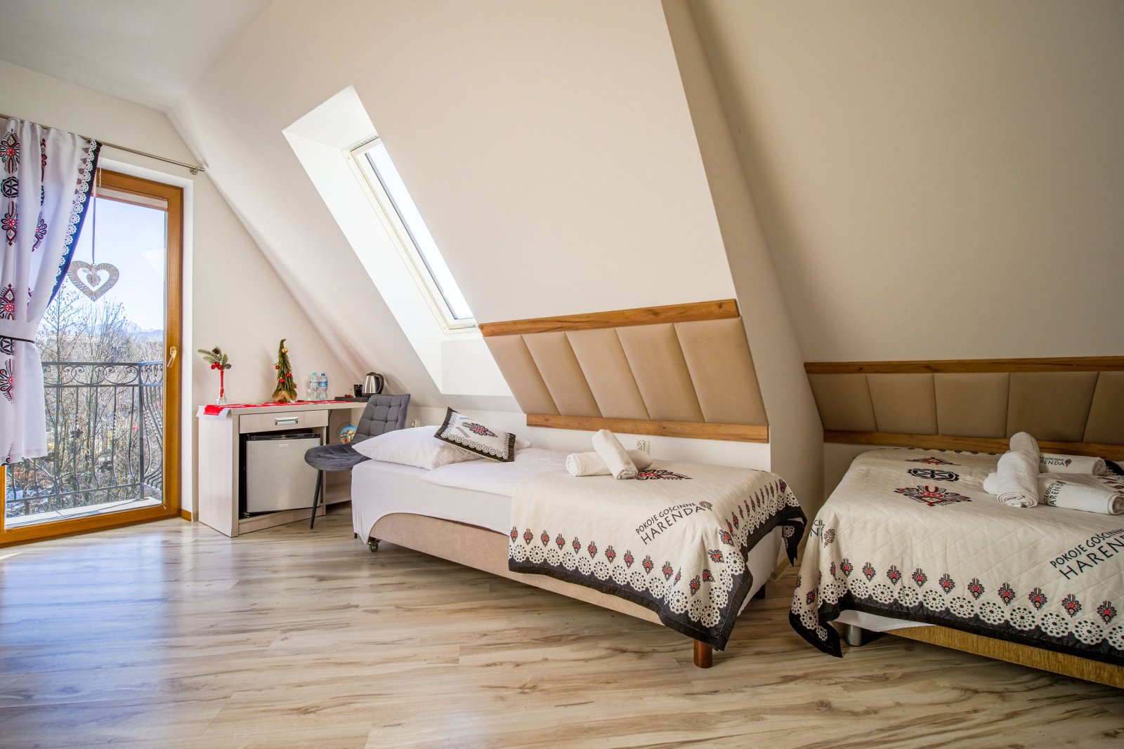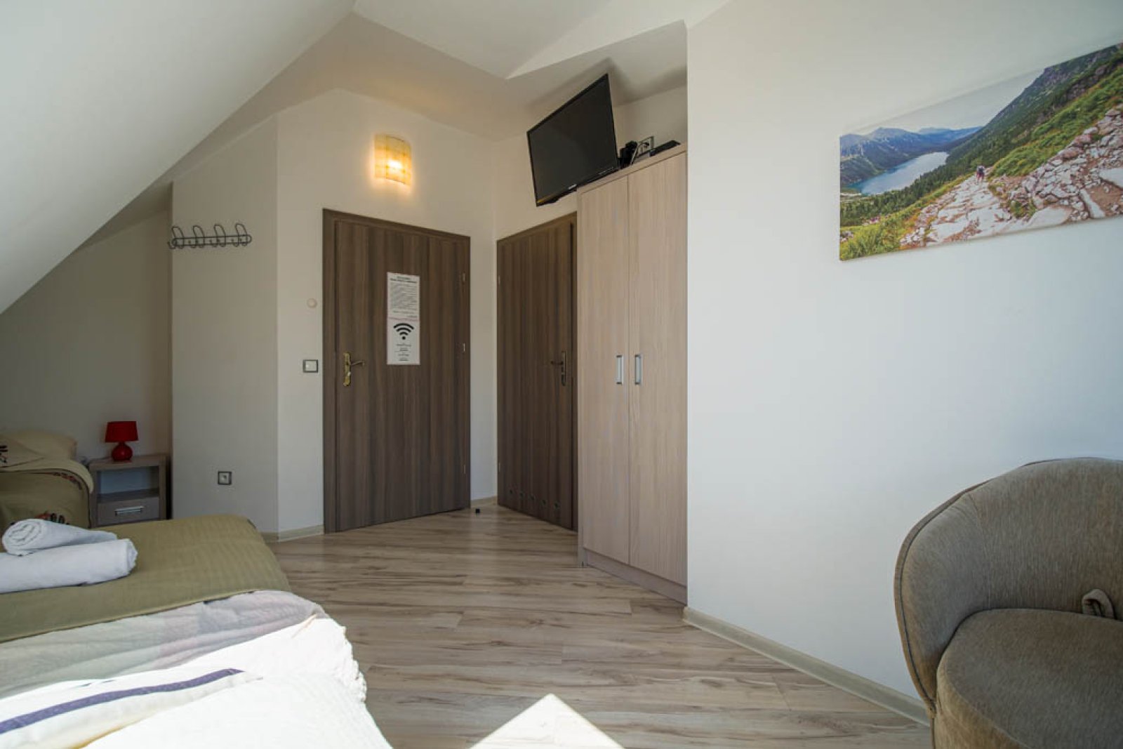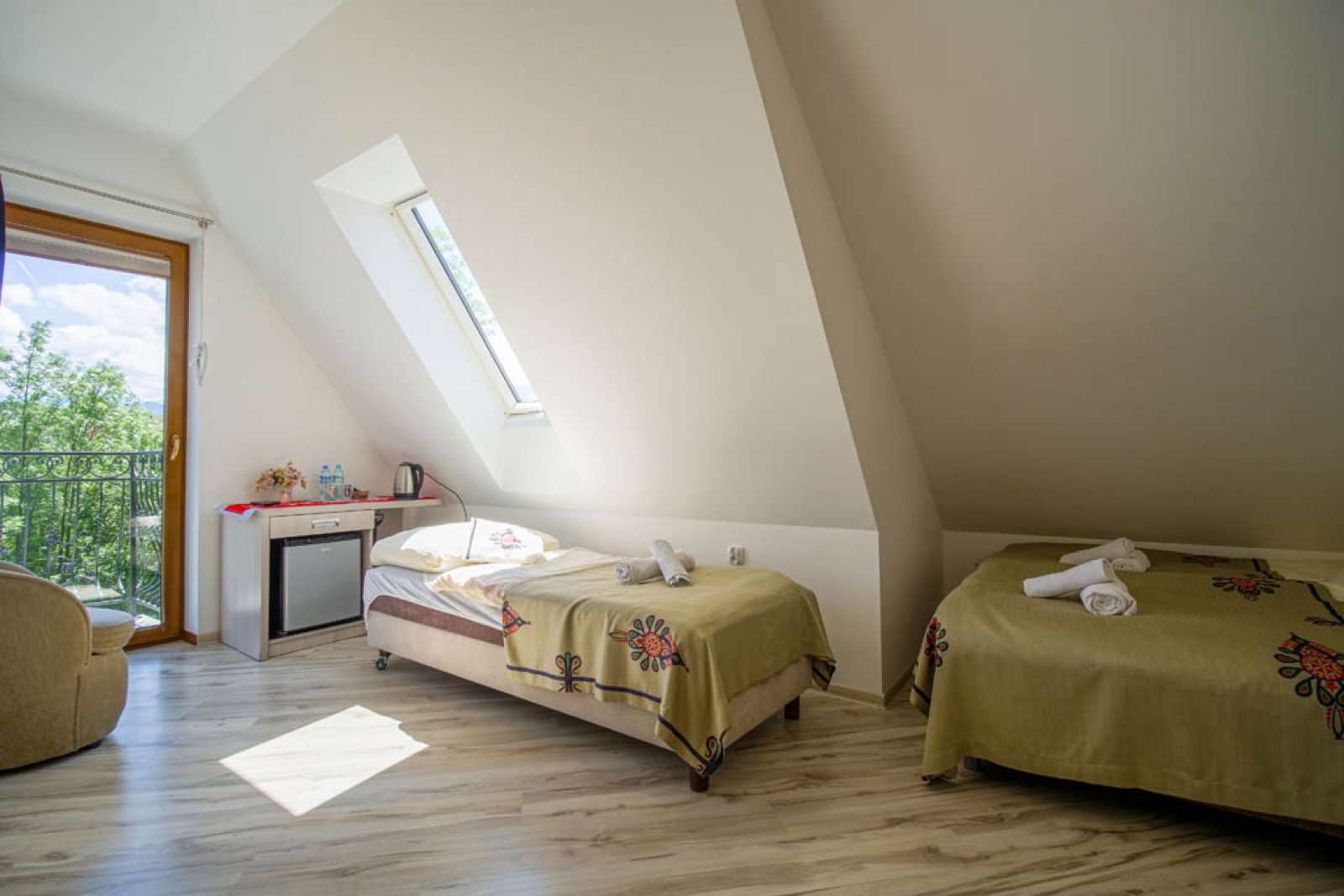 Pokój 3 osobowy. Pokój posiada łazienkę - suszarka, ręczniki, zestaw kosmetyków. W pokoju lodówka, bezpłatne WIFI, telewizor. Pokój dysponuje zestawem do kawy i herbaty. Woda mineralna, herbata, kawa. Balkon z widokiem na góry.