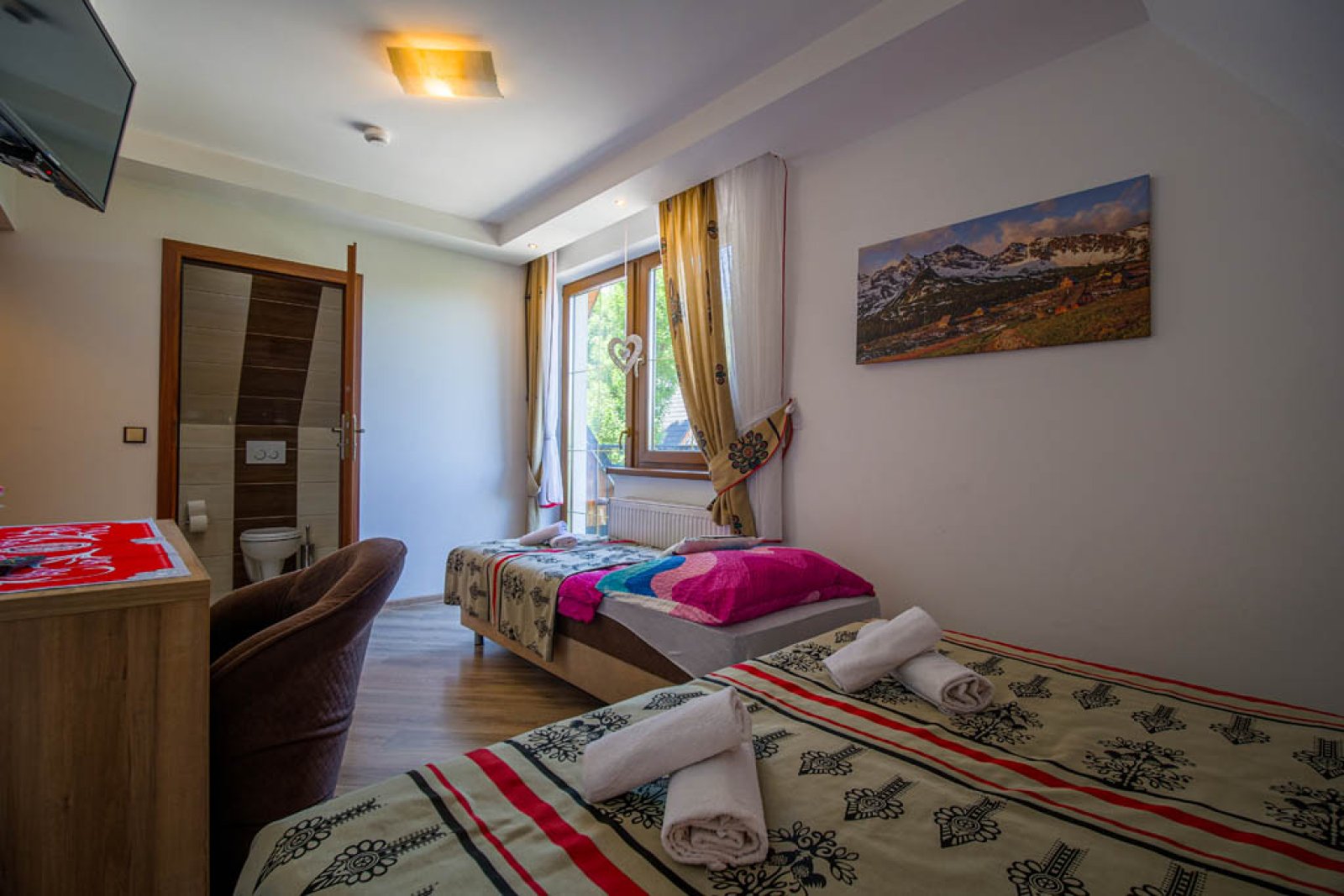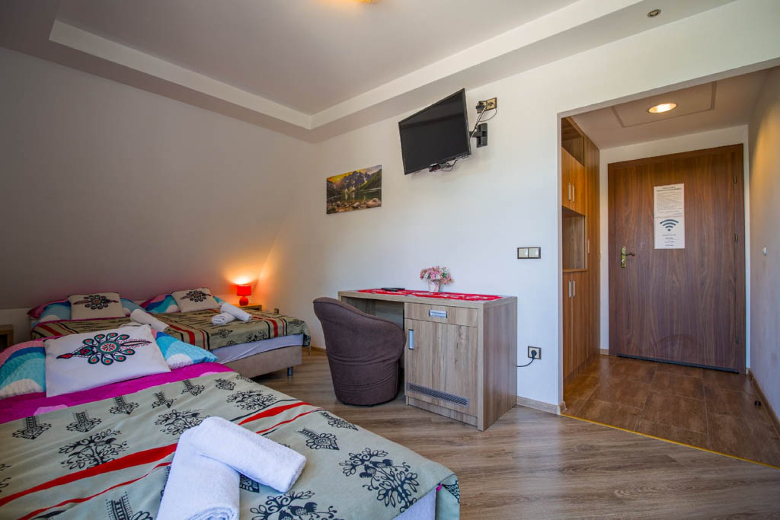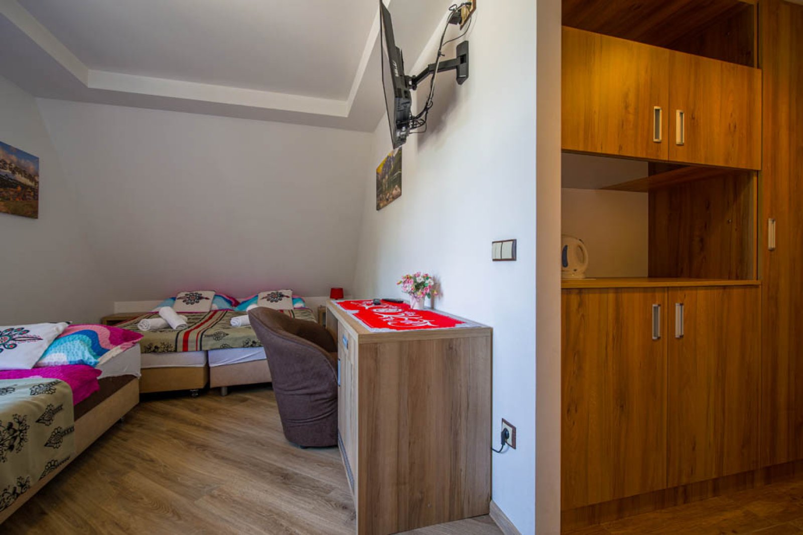 Pokój 3 osobowy. Pokój posiada łazienkę - suszarka, ręczniki, zestaw kosmetyków. W pokoju lodówka, bezpłatne WIFI, telewizor. Pokój dysponuje zestawem do kawy i herbaty. Woda mineralna, herbata, kawa. Pokój posiada balkon.