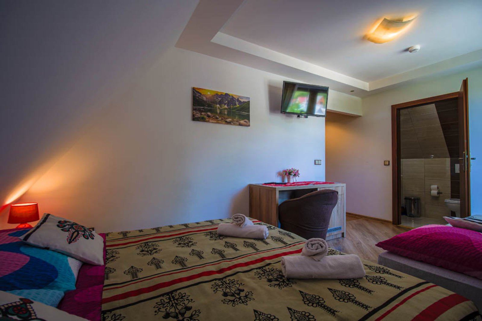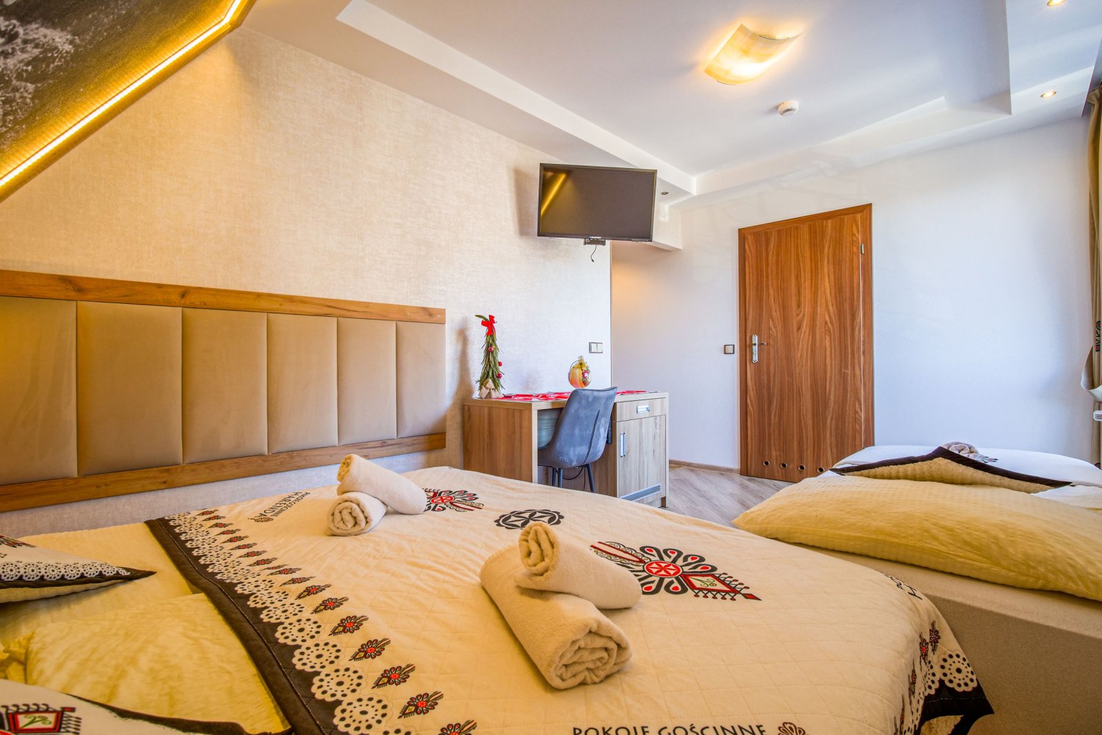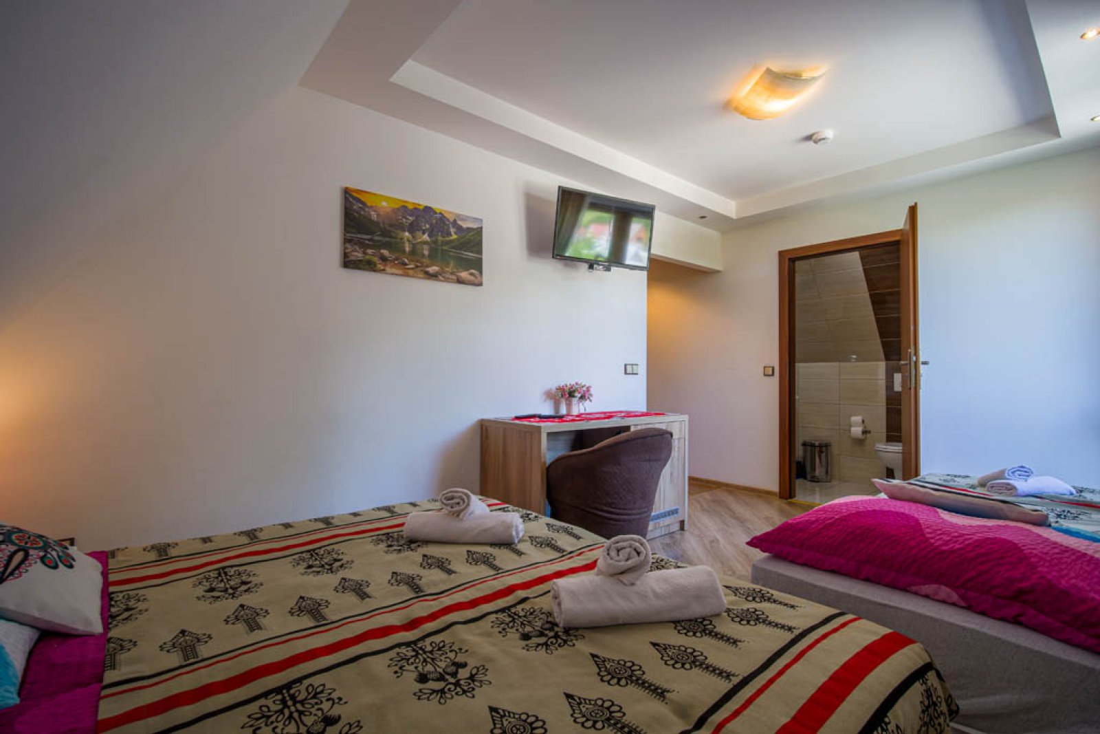 Pokój 3 osobowy. Pokój posiada łazienkę - suszarka, ręczniki, zestaw kosmetyków. W pokoju lodówka, bezpłatne WIFI, telewizor. Pokój dysponuje zestawem do kawy i herbaty. Woda mineralna, herbata, kawa. Pokój posiada balkon.
