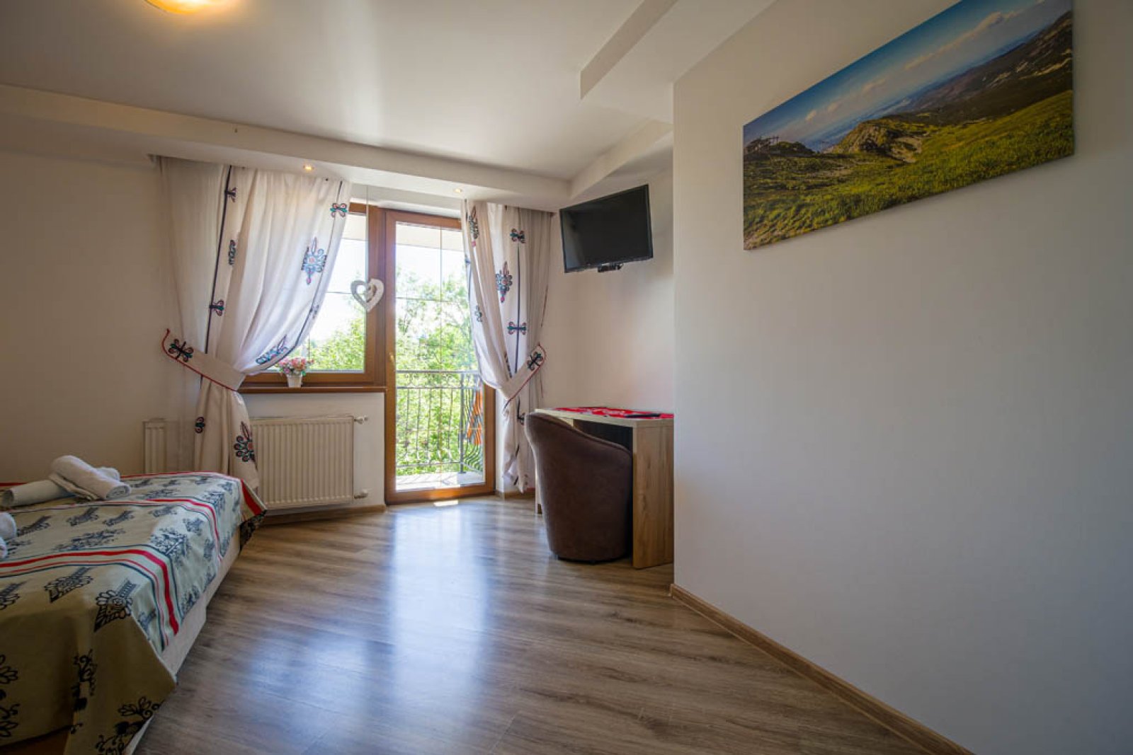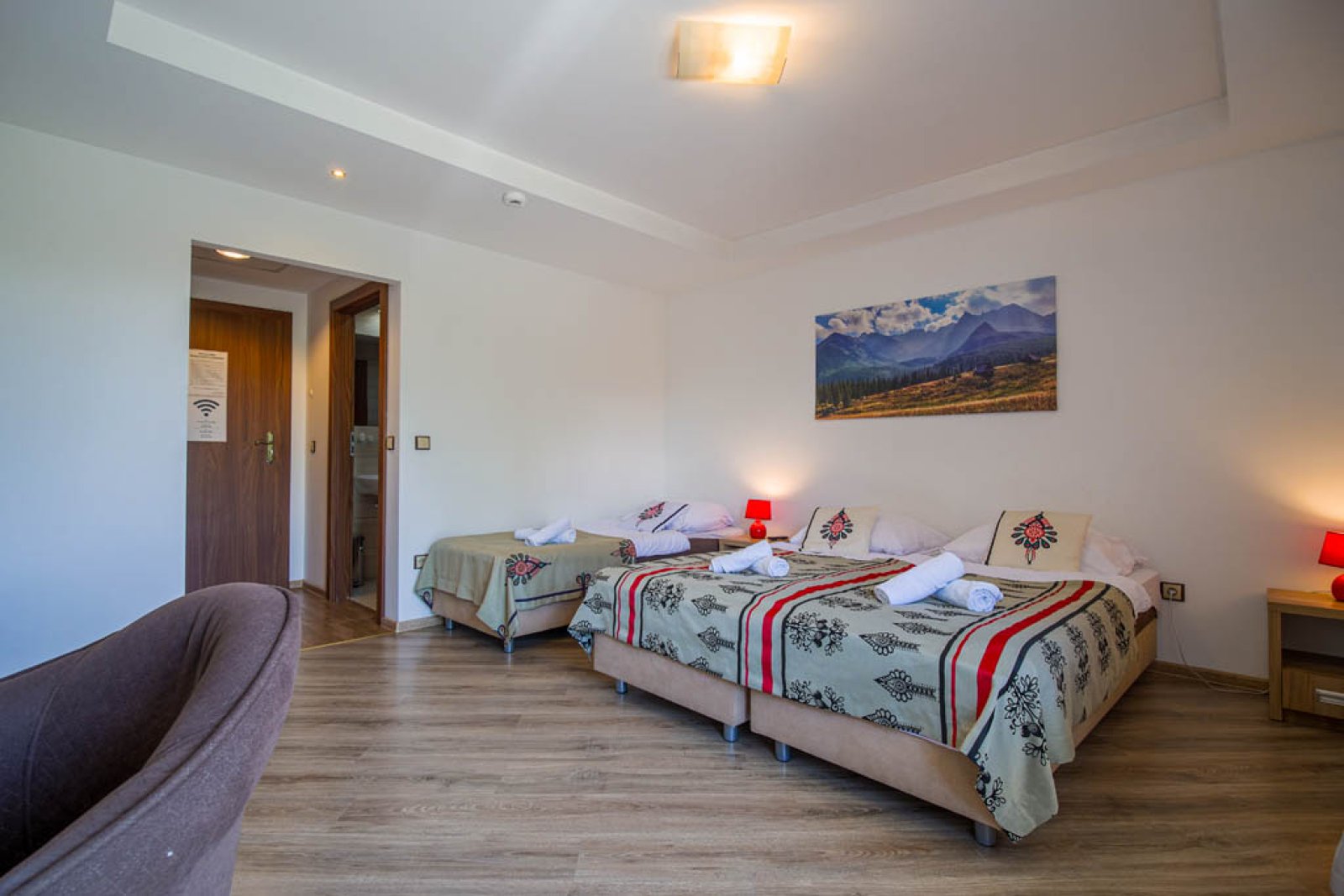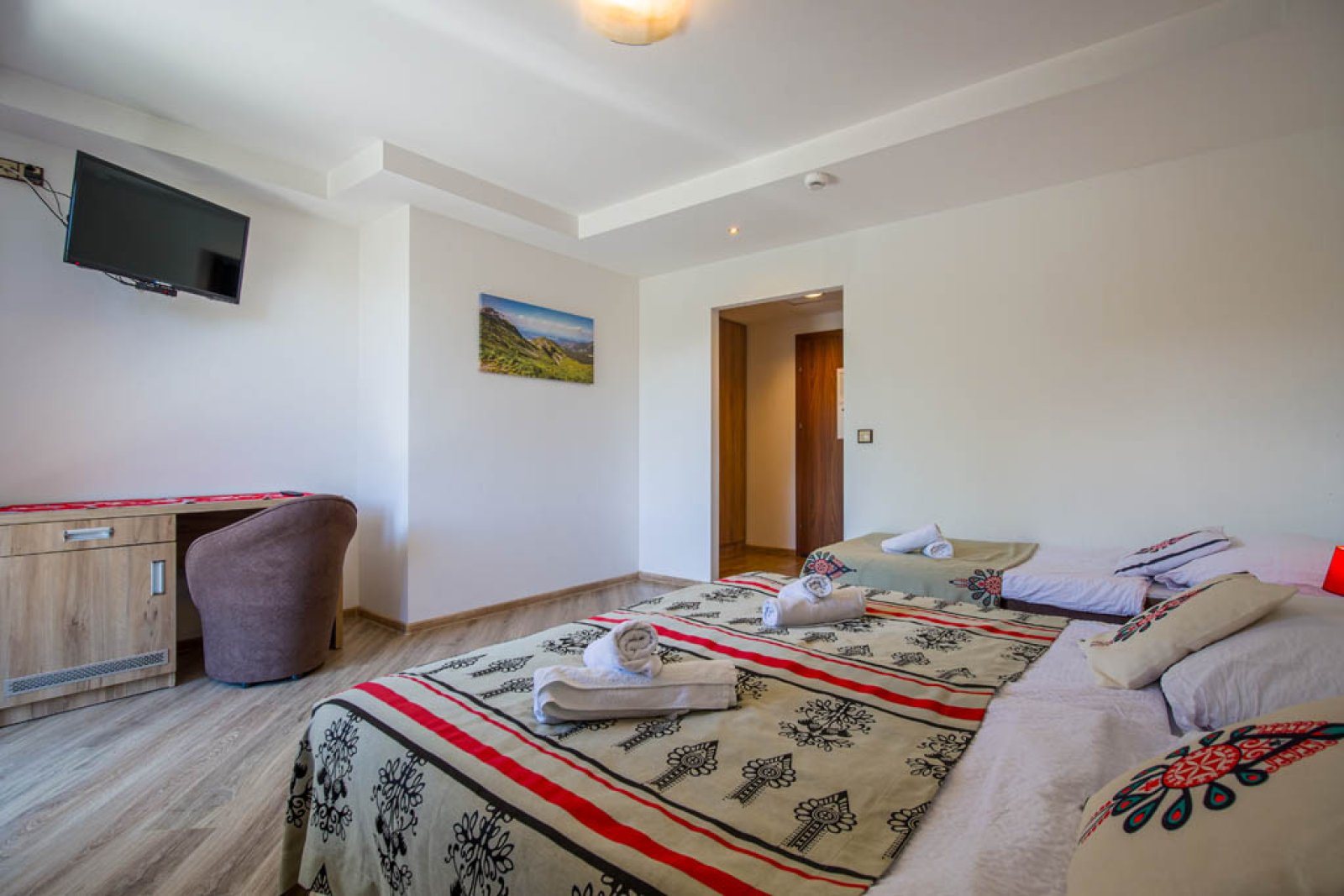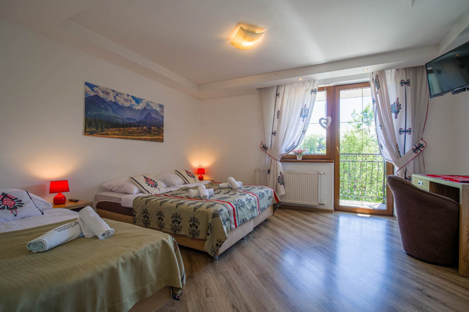 Pokój 3 osobowy. Pokój posiada łazienkę - suszarka, ręczniki, zestaw kosmetyków. W pokoju lodówka, bezpłatne WIFI, telewizor. Pokój dysponuje zestawem do kawy i herbaty. Woda mineralna, herbata, kawa. Balkon z widokiem rzekę - kojący szum potoku.