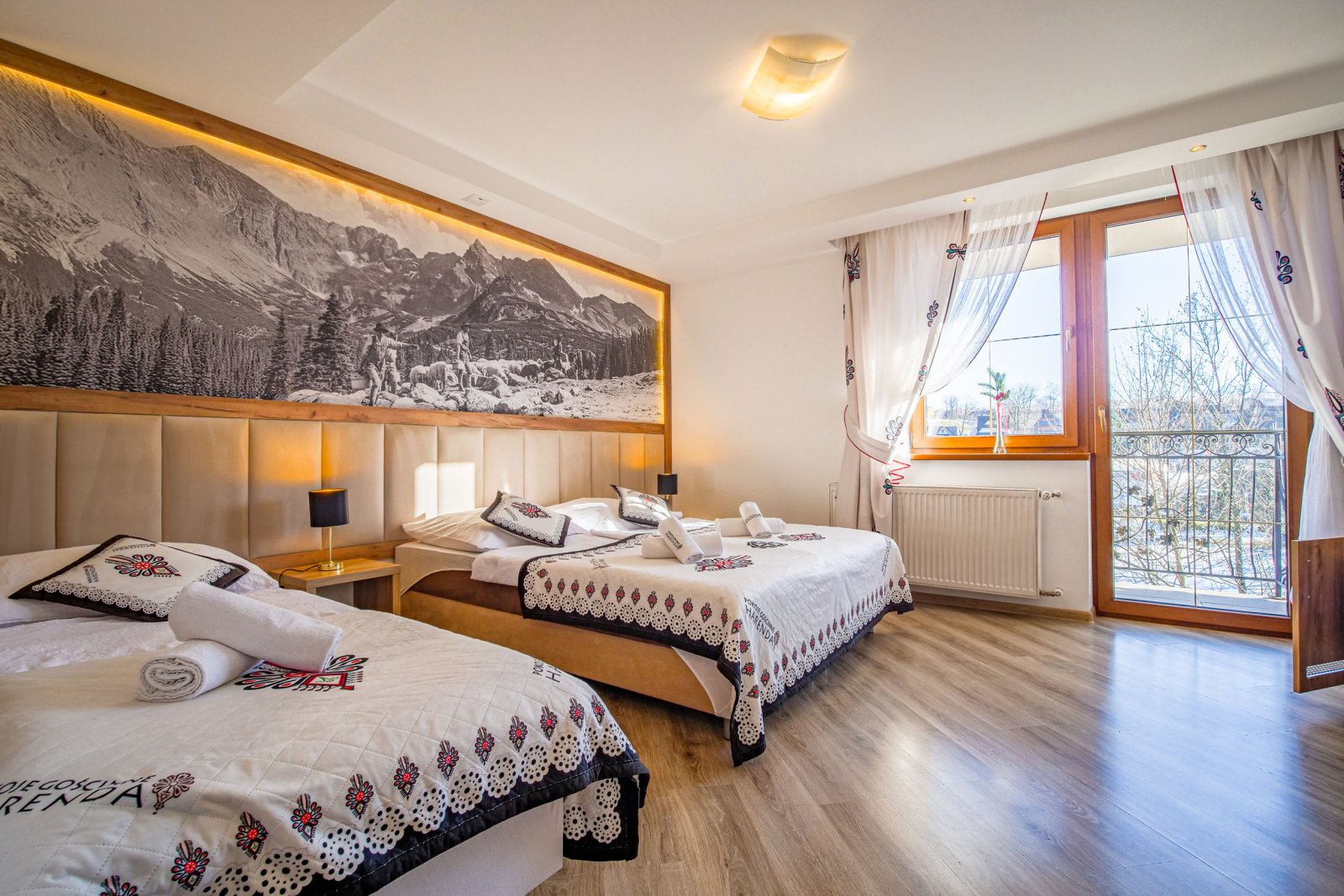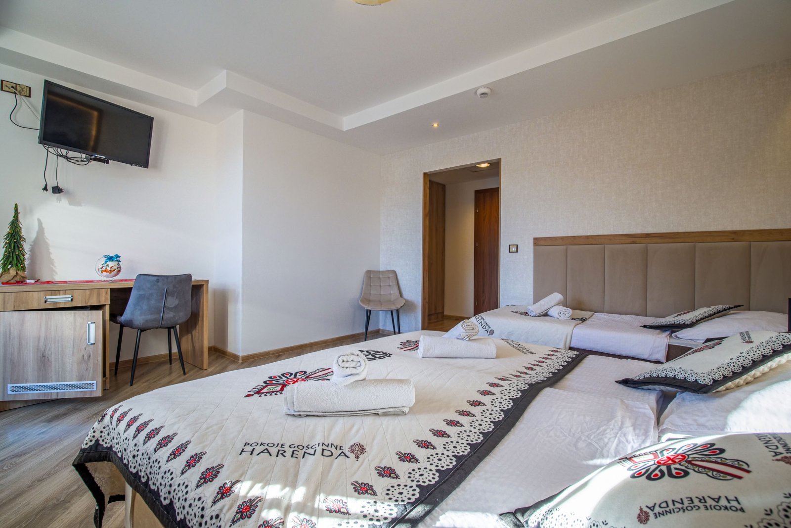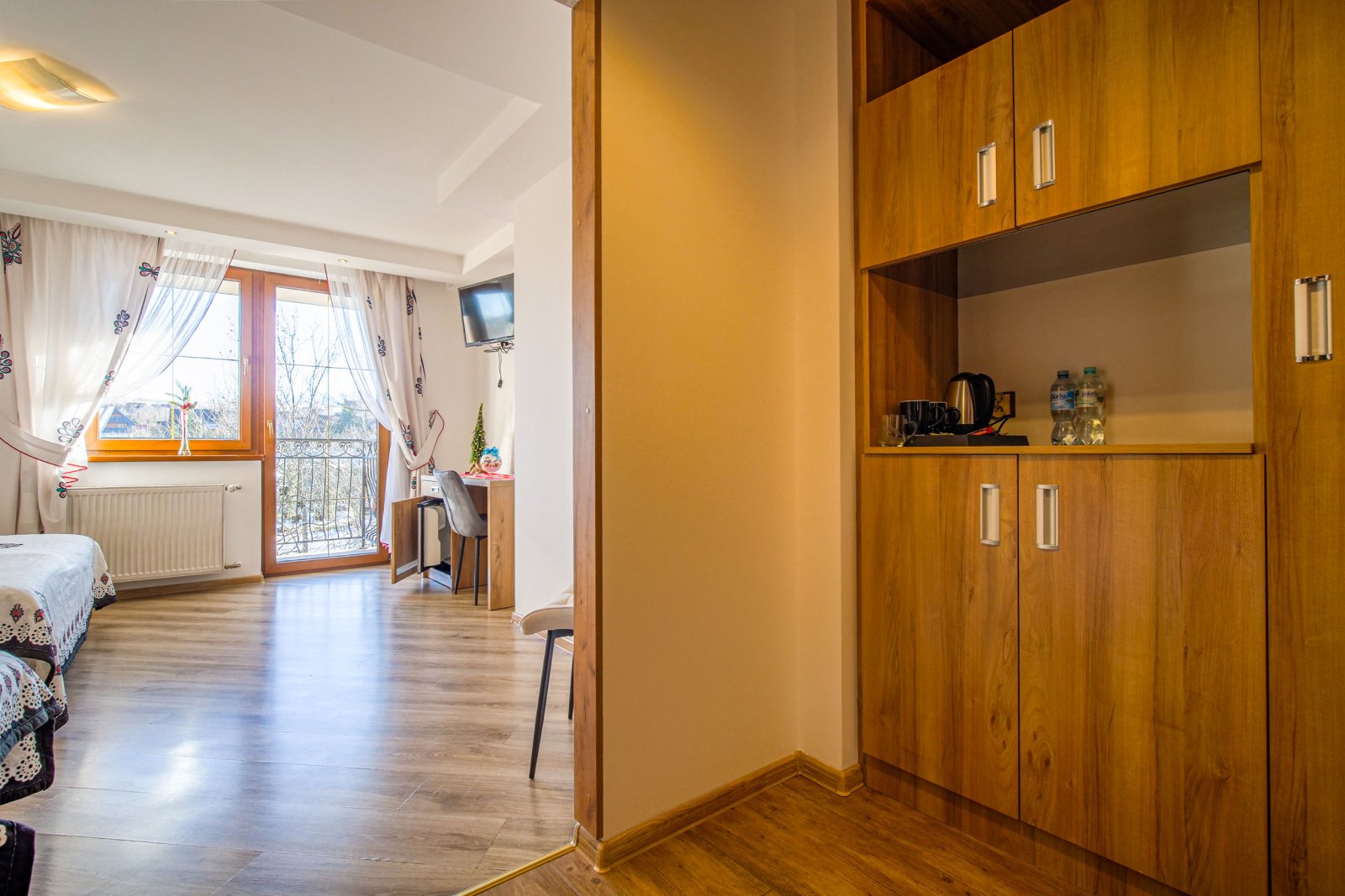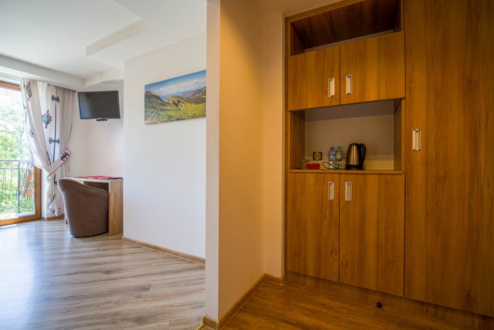 Pokój 3 osobowy. Pokój posiada łazienkę - suszarka, ręczniki, zestaw kosmetyków. W pokoju lodówka, bezpłatne WIFI, telewizor. Pokój dysponuje zestawem do kawy i herbaty. Woda mineralna, herbata, kawa. Balkon z widokiem rzekę - kojący szum potoku.