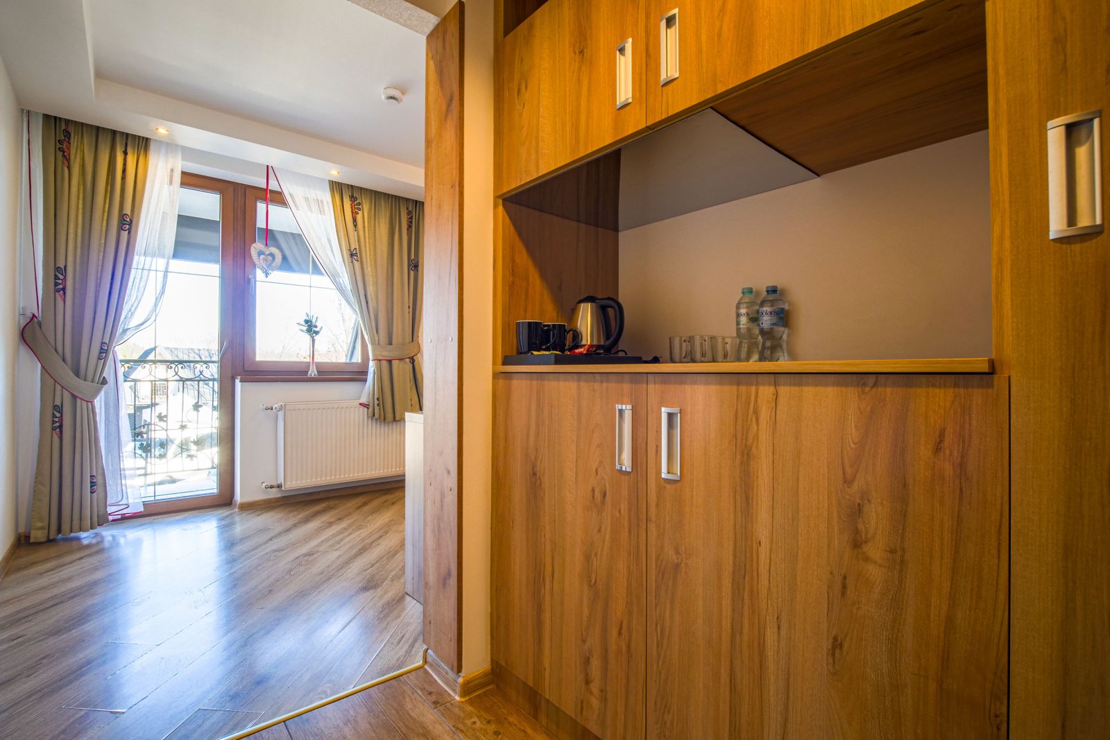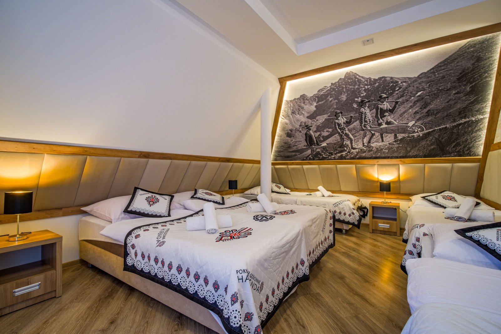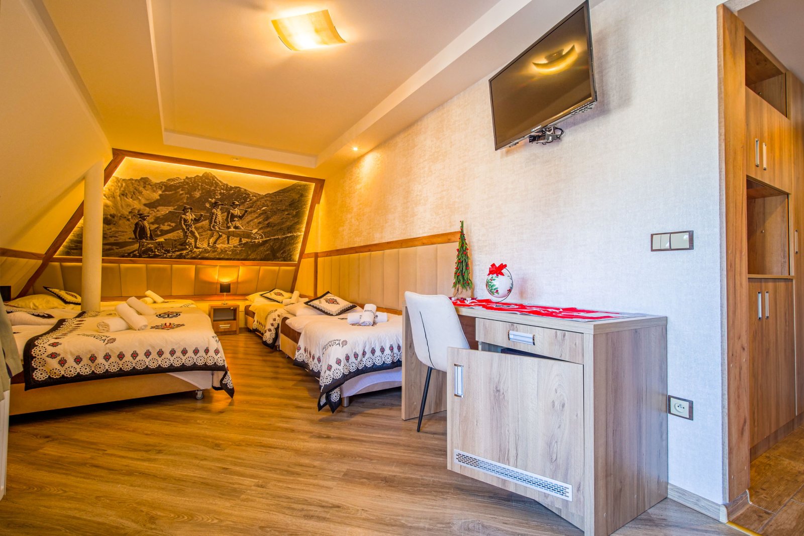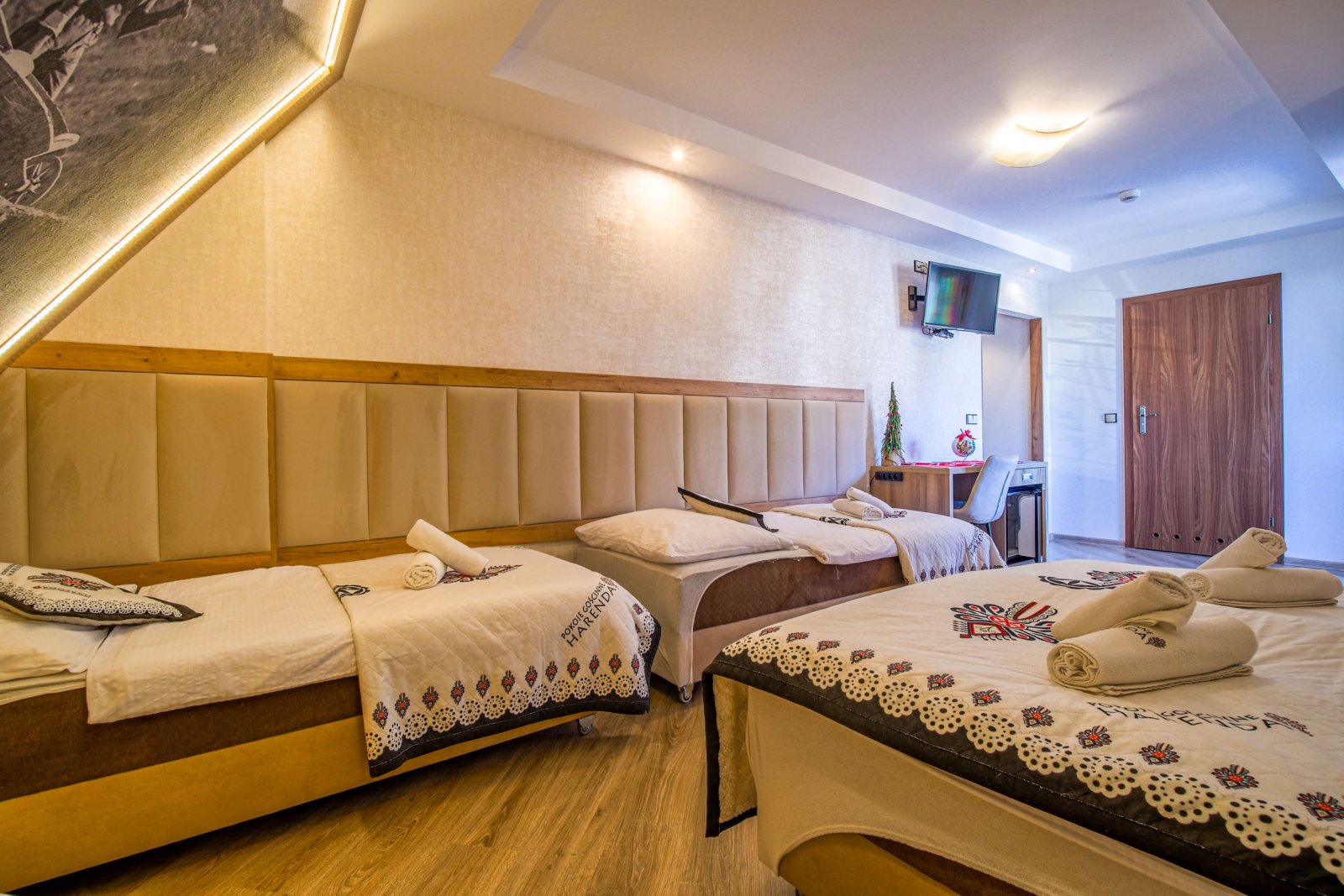 Pokój 5 osobowy. Pokój posiada łazienkę - suszarka, ręczniki, zestaw kosmetyków. W pokoju lodówka, bezpłatne WIFI, telewizor. Pokój dysponuje zestawem do kawy i herbaty. Woda mineralna, herbata, kawa. Pokój posiada balkon.